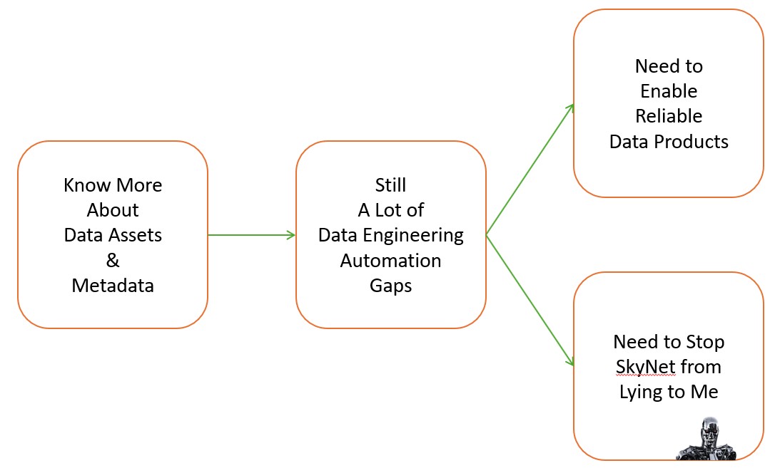 I proceeded to write what would become ciuTshi[7]: an adaptable data operations standard focused on production of consistent and rigorous metadata artifacts for each data asset within an organizations data architectures. Though this standard was yet another flat guideline for documenting what you know you should in the course of data engineering, it did present a consideration for what should be possible towards aggregate artifact integration via metadata structures. DataOps as a term and concept is a nice one, but still places the responsibility of adapting the organization’s bespoke data practices on the shoulders of the data engineers and other data professionals. Those professionals that embrace these challenges reap the rewards in more than the initial performance gains, but it is a protracted battle for implementing critical changes that many lose.