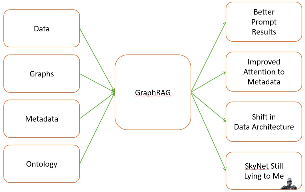 The focus on ontologies did provide us some direct avenues of impact in this domain: using highly constrained graphs of canonical knowledge expressions to focus the LLM responses to that domain of knowledge. The notion that data, metadata, domain ontologies, and compliant knowledge graphs to data governance and ontology standards could fix hallucinations in these model responses is a solid and somewhat demonstrated solution to this challenge, but still suffers many of the challenges and constraints of other fine-tuning solutions. GraphRAG does result in better prompt results, enables a more engaged discussion on improved metadata standardization around ontology and other lineage mechanisms for data assets, and shifts how we consider utilization and implementation of data architecture to support these practices, but it does not solve all response issues for expert uses of these models.