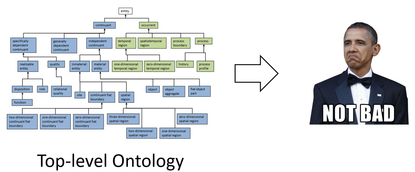 In the course of reviewing several top-level ontology approaches, I decided that the Basic Formal Ontology (BFO)[5] approach would be the most amenable to our processes and knowledge artifact goals. This system gives you a structure for defining knowledge using a hub-and-spoke approach to defining specific knowledge that encourages re-use and interoperability between specific knowledge clusters. The top-level abstract entities act as a guide by which people and their communities of practice could define their systems of knowledge without having to worry about overly specific naming conventions (something that makes interoperability between lexical databases very difficult) and instance co-population of “things” when defining their domain archetypes (something great ontologies do to their own convoluted detriment). Though this approach was the optimal one for our use case, it was still going to be a very challenging process for people to adopt and apply these expected practices.